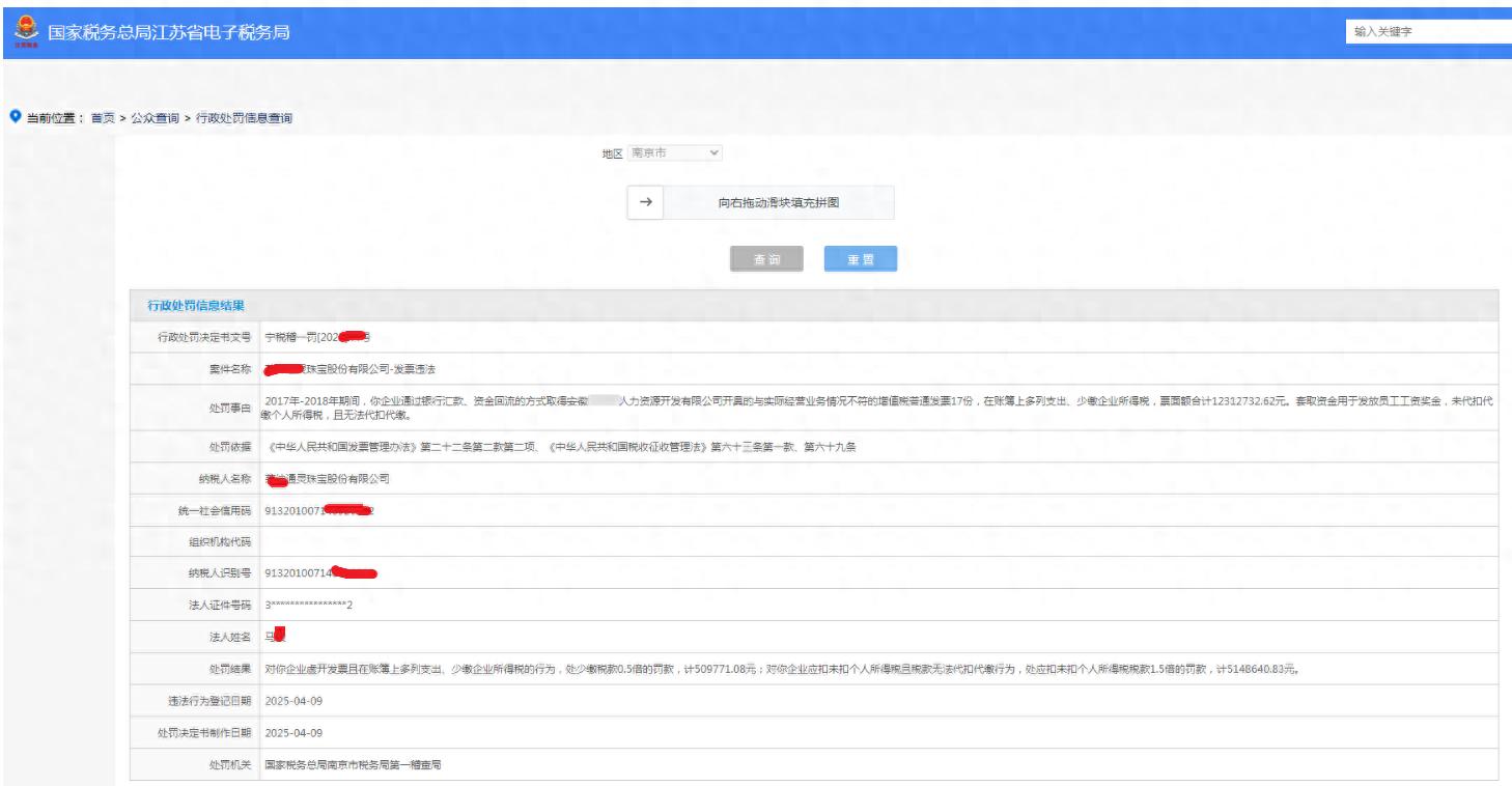 4月9日,上市公司某紳通靈珠寶股份有限公司因取得人力資源公司發票,套取資金用于發放員工工資獎金,被稅務局稽查認定為虛開,并罰款近600萬元。